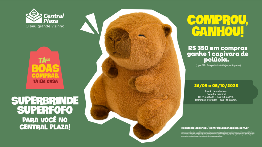 🛍️ Promoção “Boas Compras” no Central Plaza Shopping: capivara de pelúcia para quem comprar!